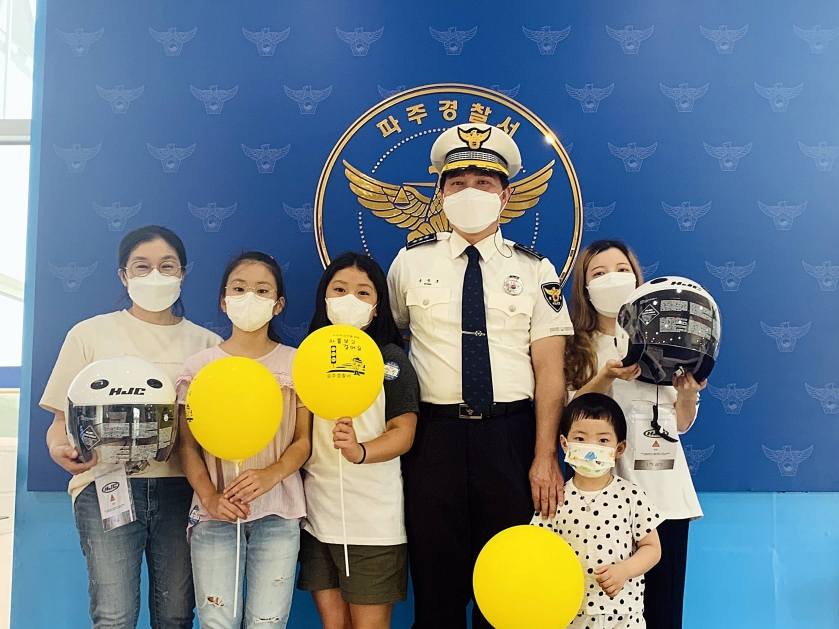 파주경찰서는 7. 12.(월) 한국교통안전공단(경기북부본부)과 합동으로 이륜차 안전운행을 위한 주민참여 이벤트를 진행하여 당첨자 중 2가족을 초청하여 직접 안전모를 전달하였다.