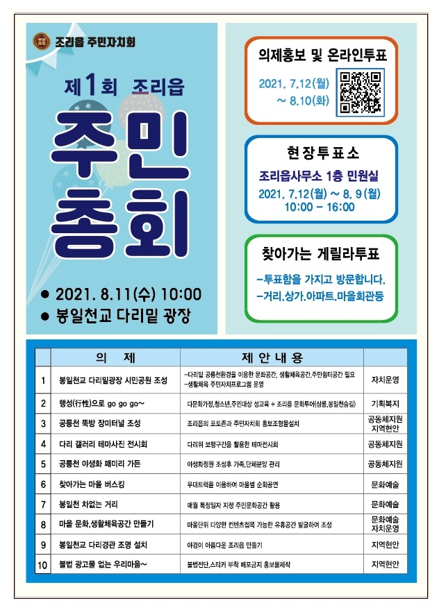 파주시 조리읍 주민자치회가 8월 11일 제1회 주민총회를 앞두고, 7월 12일부터 8월 10일까지 온·오프라인 방식으로 의제 선정을 위한 주민투표를 진행한다.