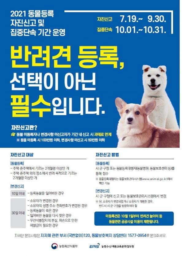 이번 자진신고 기간 내 반려동물을 신규로 등록하거나 기존 등록된 정보를 변경 신고하면 미등록이나 지연에 따른 과태료가 면제된다. 현행 「동물보호법」에 따라 지난 2014년부터 시행된 제도로, 주택·준주택에서 기르거나 이외의 장소에서 반려목적으로 기르는 2개월령 이상인 개는 의무적으로 동물등록을 해야 한다. 이미 등록했더라도 동물의 소유자, 소유자의 주소·전화번호, 동물의 상태(유실, 되찾음, 사망) 등이 변경된 경우에는 변경 신고해야 한다.