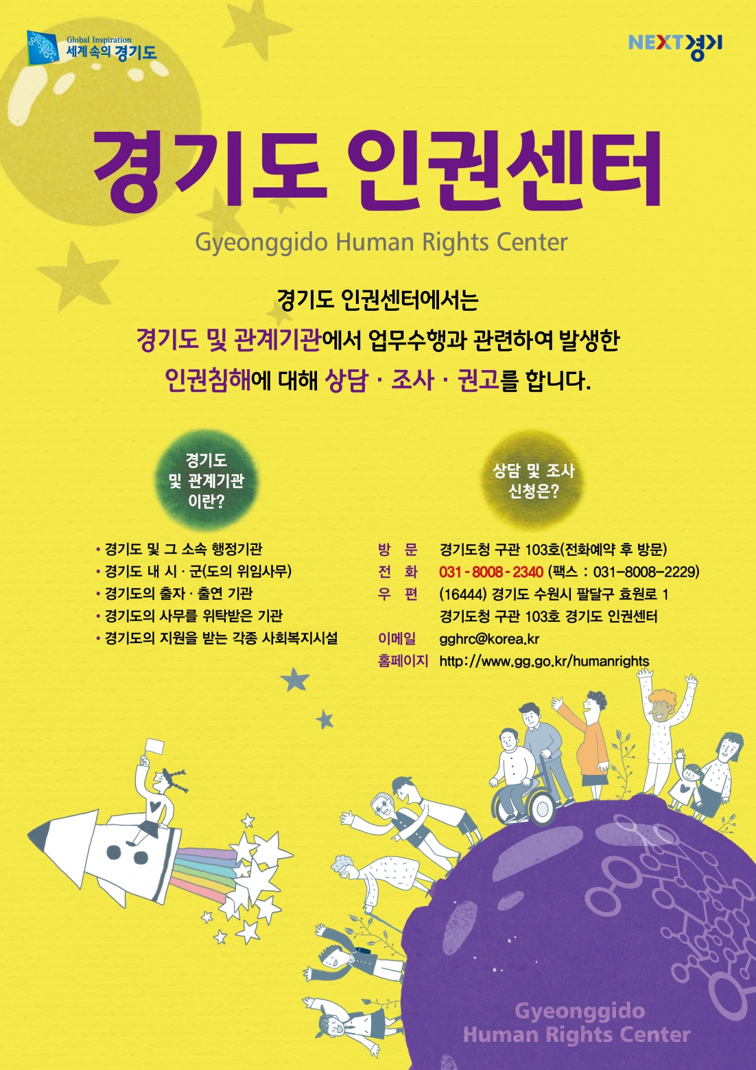 도 및 소속 행정기관, 도 출자출연기관, 도 사무위탁기관, 도의 지원을 받는 단체 및 각종 사회복지시설에서 발생한 인권침해와 차별 사건은 누구든지 경기도 인권센터에 상담․구제 신청할 수 있으며, 당사자가 아닌 제3자 신청도 가능하다(031-8008-2340, 홈페이지: www.gg.go.kr/humanrights).