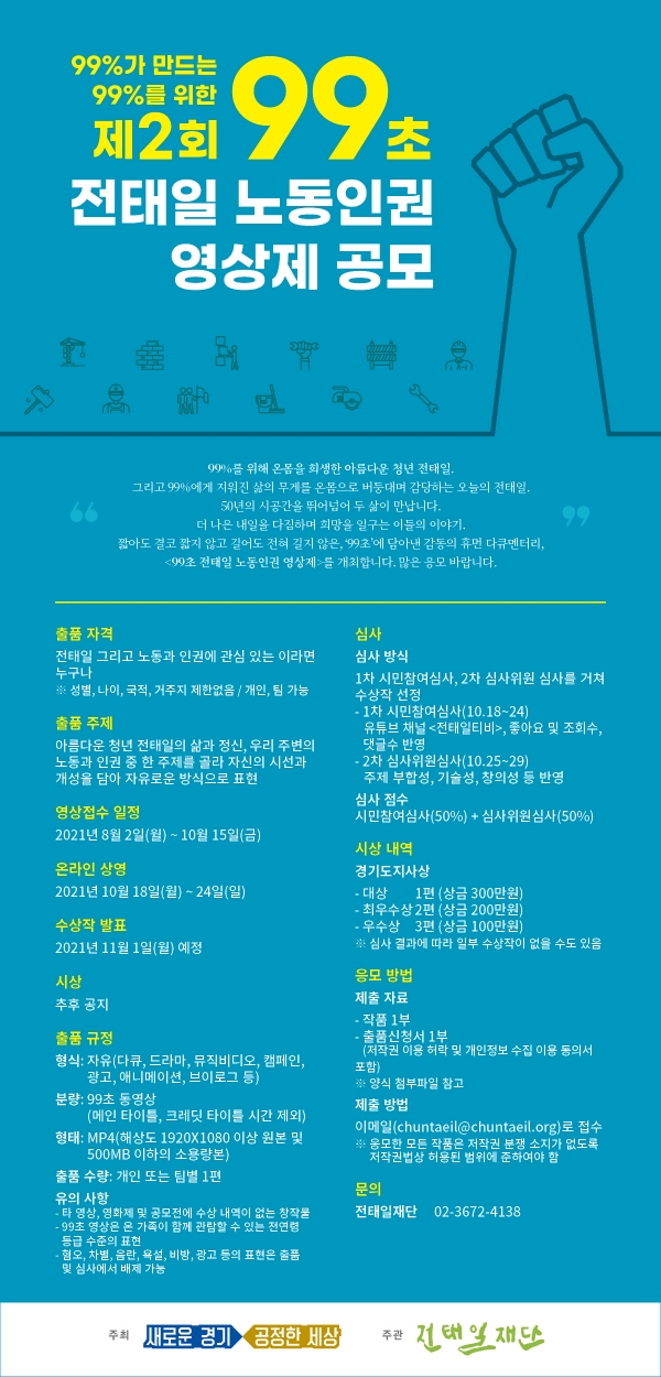 - 8월 2일 ~ 10월 15일 ‘99초 전태일 노동인권 영상제’ 공모
