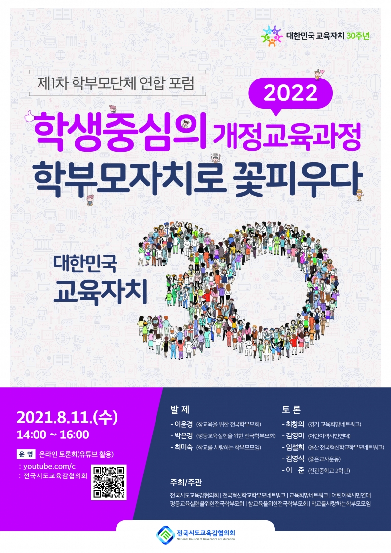 ▢ 전국시도교육감협의회(회장 최교진, 이하 협의회)는 11일(수) 오후 ‘학생중심의 2022 개정교육과정, 학부모자치로 꽃 피우다’라는 슬로건으로 제1차 학부모단체 연합포럼을 온라인으로 실시했다.