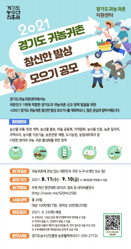 경기도와 경기도농수산진흥원이 ‘2021 경기도 귀농·귀촌 참신한 발상 모으기’를 열고 9월 10일까지 내년도 정책 발굴 아이디어를 공모한다.