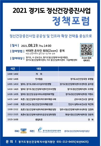 경기도가 오는 19일 오후 2시 코로나19 장기화로 수요가 커진 정신건강 정책의 우선순위 조정 및 전략 수립을 위한 ‘경기도 정신건강증진사업 정책포럼’을 온라인으로 개최한다.