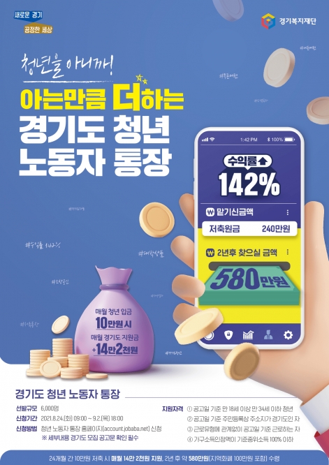경기도가 청년 노동자의 자산형성을 돕는 ‘경기도 청년 노동자 통장’ 2021년 2차 참여자 6,000명을 8월 24일부터 9월 2일까지 공개 모집한다.