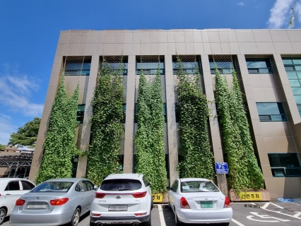파주시농업기술센터 본관 건물 외벽에 덩굴식물을 이용해 그린커튼을 만들었고, 에너지절약 및 녹색식물 재배를 통한 탄소배출량 감소 효과를 기대하고 있다.