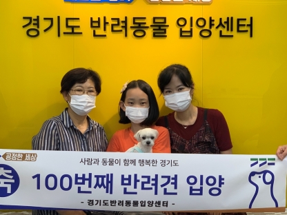 유기동물 입양문화 확산을 위해 지난해 10월 수원에 문을 연 ‘경기도 반려동물 입양센터’에서 100번째 입양견이 탄생했다.