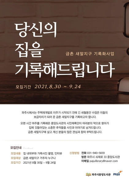 금촌 새말지구 거주자는 누구나 참여할 수 있으며 전화(031-940-5659), 이메일(pajulibrary@naver.com) 또는 방문(파주시 쇠재로 33, 중앙도서관 기록관리팀)해 신청하면 된다.