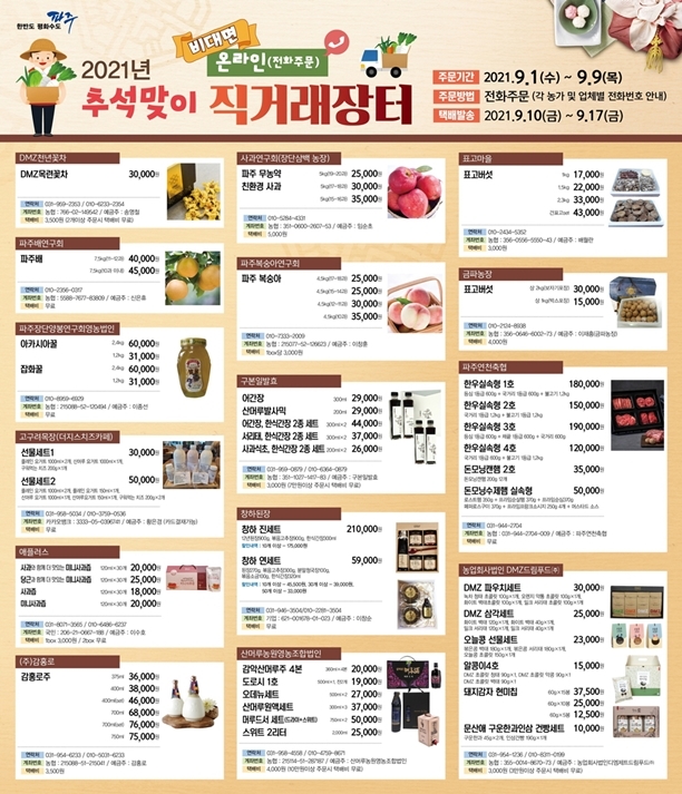 파주시는 민족 최대 명절인 추석을 앞두고 지역경제 활성화를 위한 2021년 추석맞이 전화주문 직거래장터를 9월 1일부터 9일까지 운영한다.