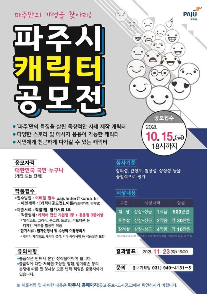 김이겸 홍보담당관은 “파주를 대표할 수 있는 개성 있는 캐릭터를 활용해 시민들에게 더욱 친근하게 다가가고 소통할 것”이라며 “많은 참여자들의 번뜩이는 재치와 아이디어를 기다린다”고 말했다.