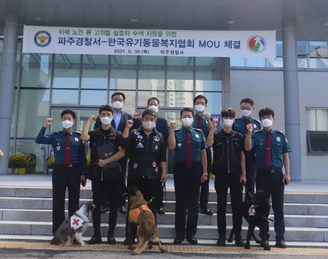 파주경찰서는 9.30.(목) 10:00 파주경찰서 임진 마루(4층)에서 (사)한국유기동물복지협회(협회장 임장춘)와 “치매 노인 등 고위험 실종자 수색 지원을 위한 치안 협력 업무협약(MOU)” 체결하였다고 밝혔다.