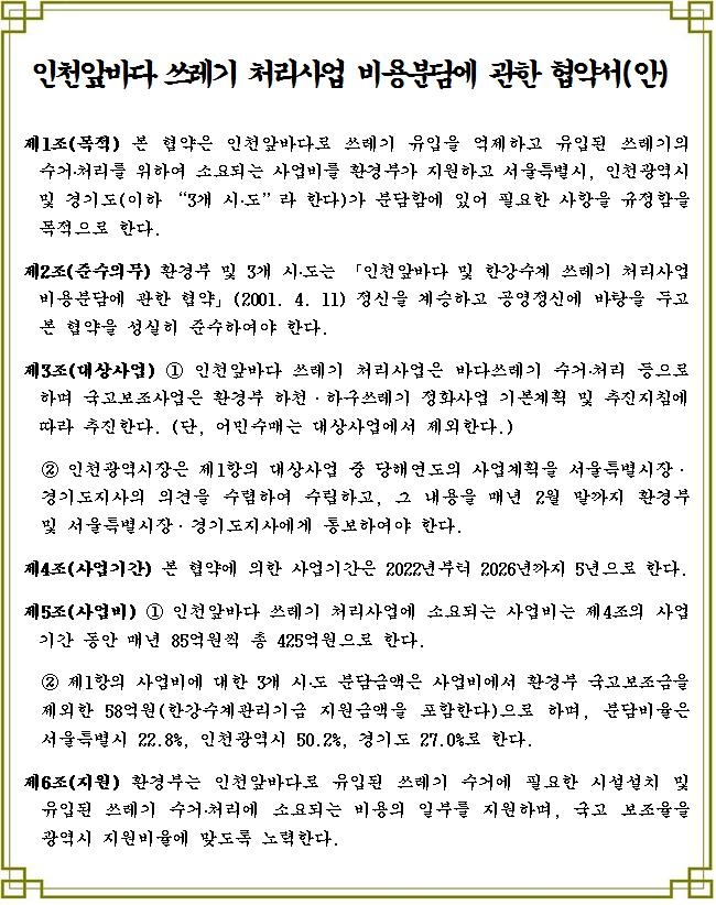 ‘인천 앞바다 쓰레기 처리 사업’에는 도와 환경부, 서울시, 인천시가 내년부터 매년 85억 원씩 5년간 총 425억 원을 부담한다. 4차 협약보다 총 15억 원이 증가했다. 연도별 사업비 85억 원 중 27억 원은 환경부에서 지원하고, 나머지 금액은 경기도 27%, 서울특별시 22.8%, 인천광역시 50.2%로 나누어 분담한다.