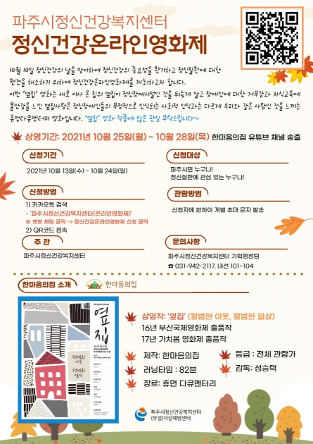 영화제 관람을 원하는 시민은 10월 24일까지 카카오톡 ’파주시정신건강복지센터(온라인영화제) 검색 또는 QR코드로 신청이 가능하다. 신청자에 한해 10월 25일부터 10월 28일까지 한마음의집 유튜브 채널을 통해 관람할 수 있다.