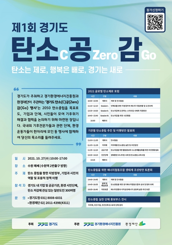 경기도가 2050 탄소중립을 목표로 지방정부, 기업과 단체, 그리고 시민들과 함께 기후위기 해결과 협력을 논의하기 위해 오는 27일 수원역 인근 수원메쎄에서 ‘제1회 경기도 탄소(C)공(Zero)감(Go)’ 행사를 개최한다.