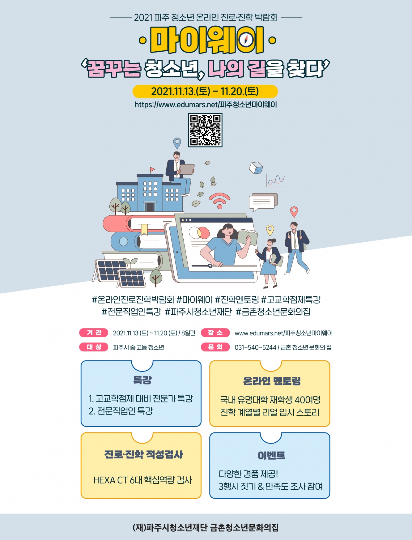 파주시청소년재단 금촌청소년문화의집(관장 김형수)에서는 다음달 13일부터 20일까지 ‘2021 파주 청소년 온라인 진로진학 박람회 – 마이웨이’를 개최한다고 밝혔다.