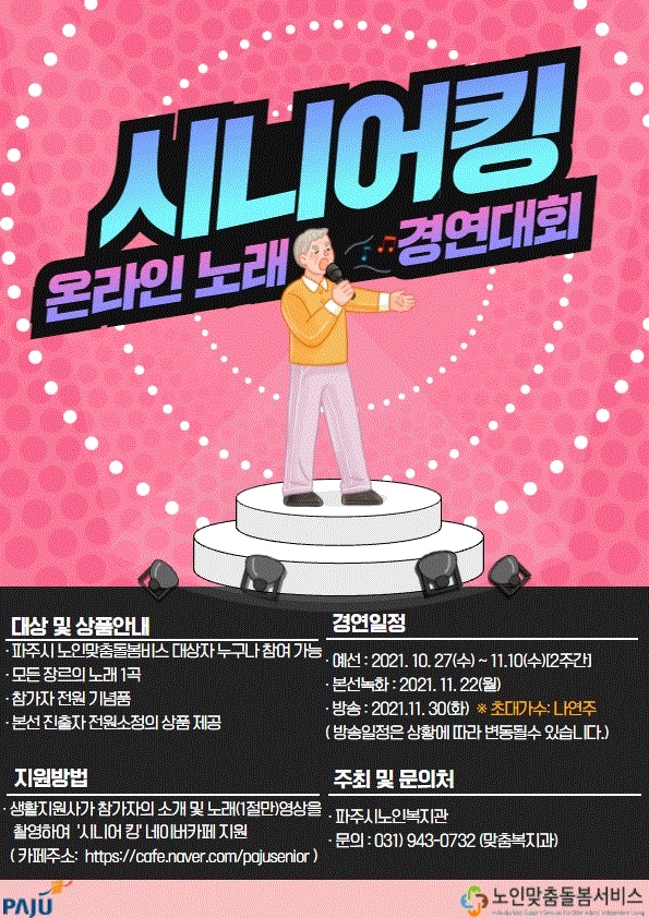 노인맞춤돌봄서비스는 만 65세 이상의 국민기초생활수급자, 차상위계층 또는 기초연금수급자를 대상으로 방문 안부확인, 생활지원 등 맞춤형 돌봄서비스를 제공하는 사업이다. 이번 노래자랑은 파주시 관내 노인맞춤돌봄서비스를 받고 계신 어르신들을 대상으로 진행하는 온라인 노래자랑이다.