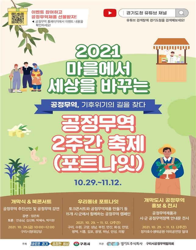 제3세계 국가 생산자들에게 정당한 가격을 지급하는 공정무역을 알리기 위한 ‘2021 경기도 공정무역 2주간 축제(포트나잇, FortNight)’ 행사가 오는 29일 구리시에서 개막해 11월 12일까지 도내 15개 시 곳곳에서 펼쳐진다.