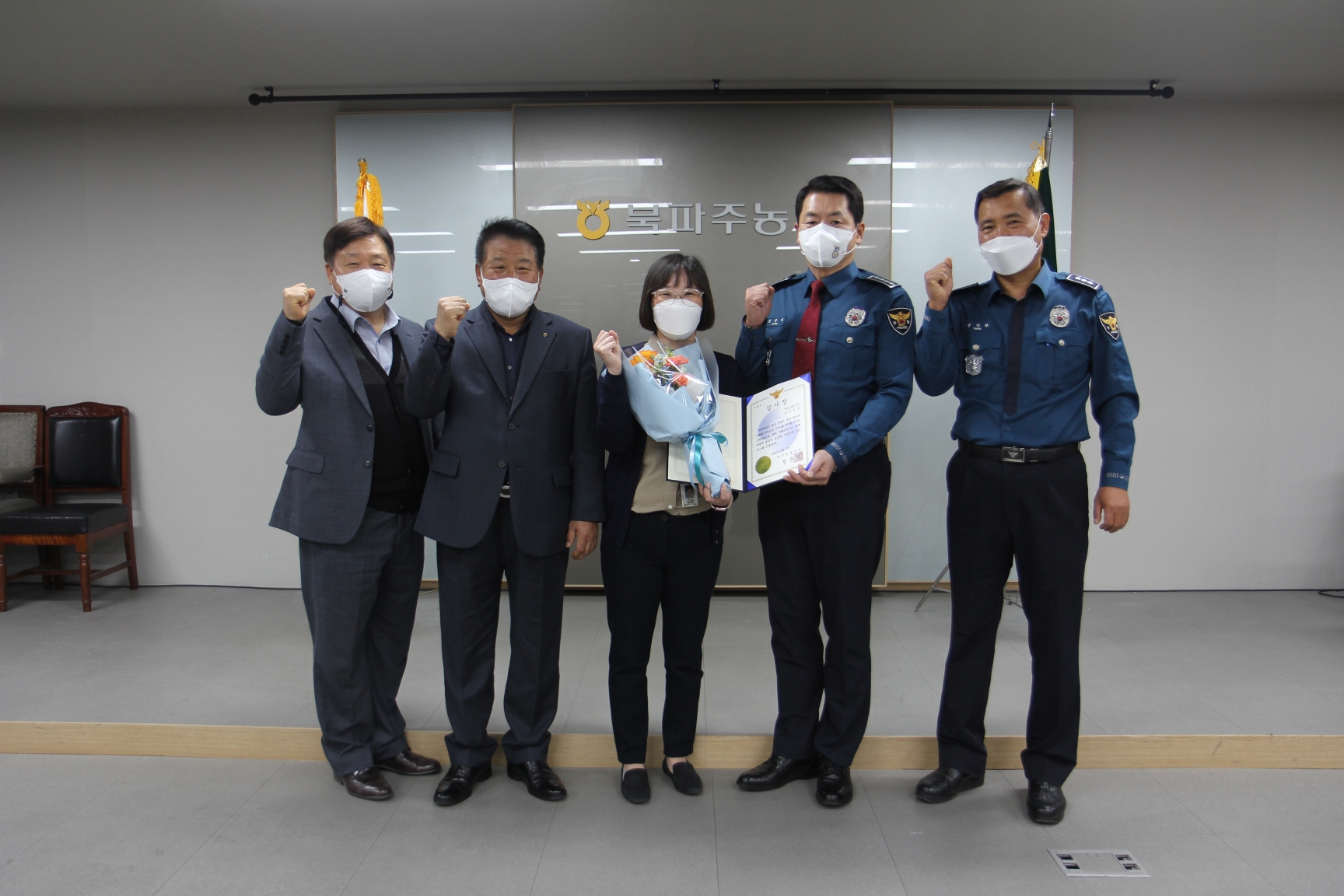 파주경찰서장(총경 정문석)은 10.21.(목) 13:00경 보이스피싱 범죄에 속아 북파주농협(파주 문산읍)을 찾아가 6,000만원을 인출 하려던 피해자 A(60대, 男)를 수상히 여기고, 계좌 지급정지 등 조치를 통해 보이스피싱 범죄를 예방한 창구 직원 B씨 찾아가 감사장을 전달하였다고 전했다.