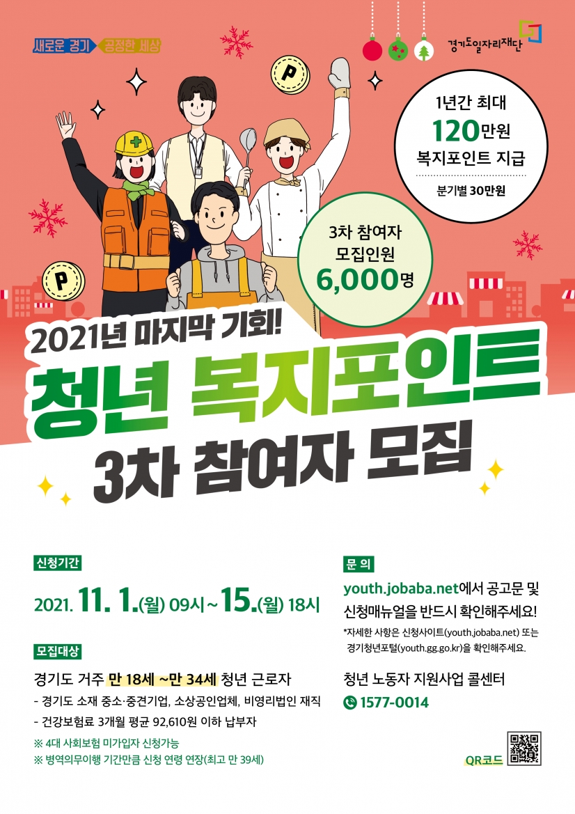 경기도가 도내 청년 노동자들의 복리후생과 처우 개선을 위한 ‘청년 복지포인트’ 3차 참여자 6,000명을 11월 15일까지 공개 모집한다.