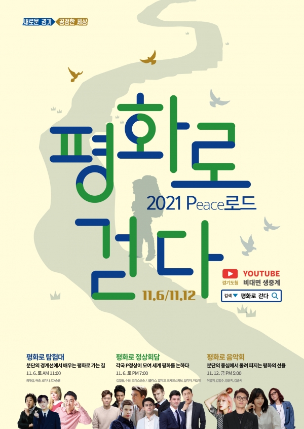 경기도청 유튜브 채널(youtube.com/user/ggholics)에서 생중계되는 이번 행사는 크게 ▲6일 오전 11시 ‘평화로 탐험대’ ▲6일 오후 7시 ‘평화로 정상회담’ ▲12일 오후 5시 ‘평화로 음악회’ 등 3가지로 구성됐다.