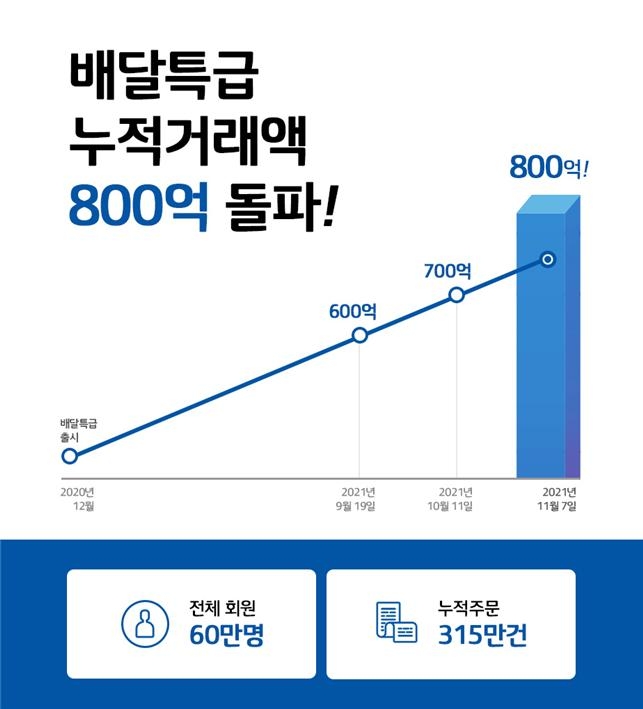 경기도주식회사는 이달 7일 기준 배달특급 총 누적 거래액이 800억 원을 돌파했다고 8일 밝혔다. 회원 60만 명, 누적 거래액 315만 건을 넘어서며 초기의 우려를 불식하고 꾸준한 우상향 성장 그래프를 그리는 중이다.