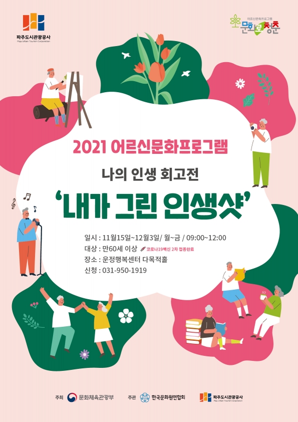 파주도시관광공사는 문화체육관광부가 주최하고 한국문화원연합회가 주관하는 2021년 어르신문화프로그램 지원사업 <나의 인생 회고전 ‘내가 그린 인생샷‘> 프로그램을 무료로 제공할 예정이다.