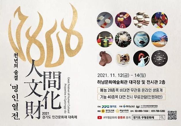 경기도가 11월 12일부터 14일까지 하남문화예술회관 대극장에서 경기도무형문화재 68종목을 대중에 공개하는 ‘2021 경기도 인간문화재 대축제’를 개최한다.