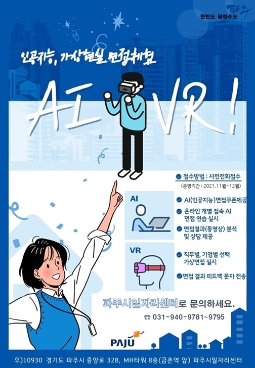 AI·VR 면접 체험은 11월~12월 두 달간 사전 예약을 통해 이용할 수 있으며, 기타 문의사항은 파주시 일자리경제과(031-940-5101) 또는 파주시일자리센터(031-940-9781~8)로 문의하면 된다.