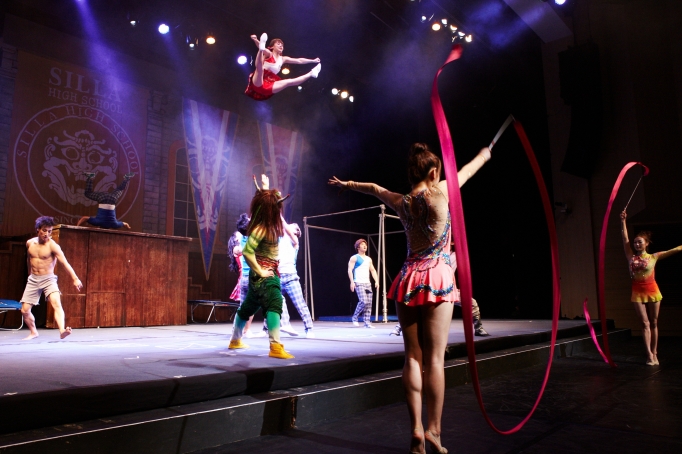 리듬체조, 기계체조, 치어리딩, 마샬아츠, 비보잉이 접목된 역동적이고 현대적인 공연 플라잉은, 신라에서 현대로 넘어온 화랑과 도깨비, 치어리딩 대회를 준비하는 학생들이 펼치는 좌충우돌 이야기를 담고 있다. 대사없이 몸짓으로만 이야기를 펼쳐 보이는 유쾌하고 코믹 가득한 넌버벌 퍼포먼스로 진행된다.