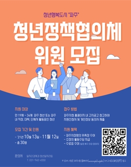 파주시가 청년들의 능동적인 사회참여 기회를 보장하고 소통을 통한 수혜자 중심의 청년정책 발굴을 위해 ‘청년정책협의체’ 위원을 공개모집 한다.