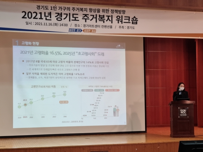 정소이 수석연구원은 ‘고령자 1인 가구를 위한 주거지원 방안’ 주제 발표를 통해 고령자의 83.8%가 현재 집에서 계속 거주하기를 희망한다는 조사 결과를 인용하며 주택 개조, 전·월세 등 다양한 지원 방안이 필요하다고 강조했다.