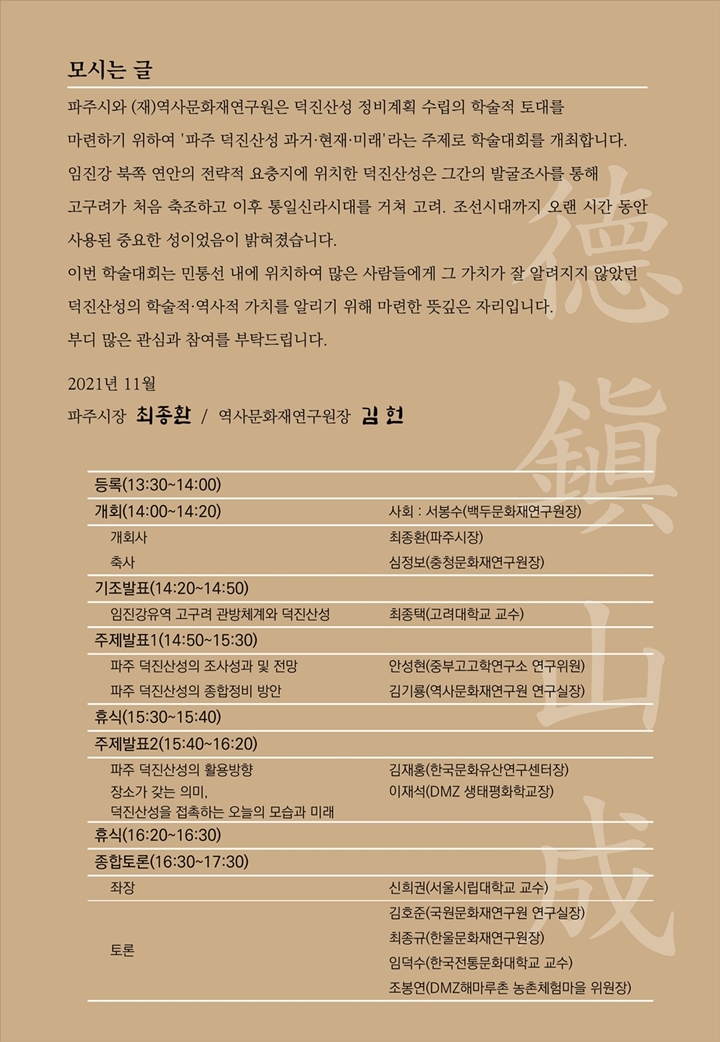 파주시는 민통선 내에 위치해 많은 사람들에게 알려지지 않았던 덕진산성의 학술적·역사적 가치를 재조명하고 미래지향적인 역사·문화 공간으로 조성해나가고자 이번 학술대회를 기획했다.