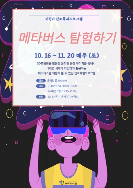파주시 교하도서관은 10월 16일부터 11월 27일까지 엔닷라이트와 함께 어린이 진로독서프로그램으로 ‘메타버스 탐험하기’를 진행했다.
