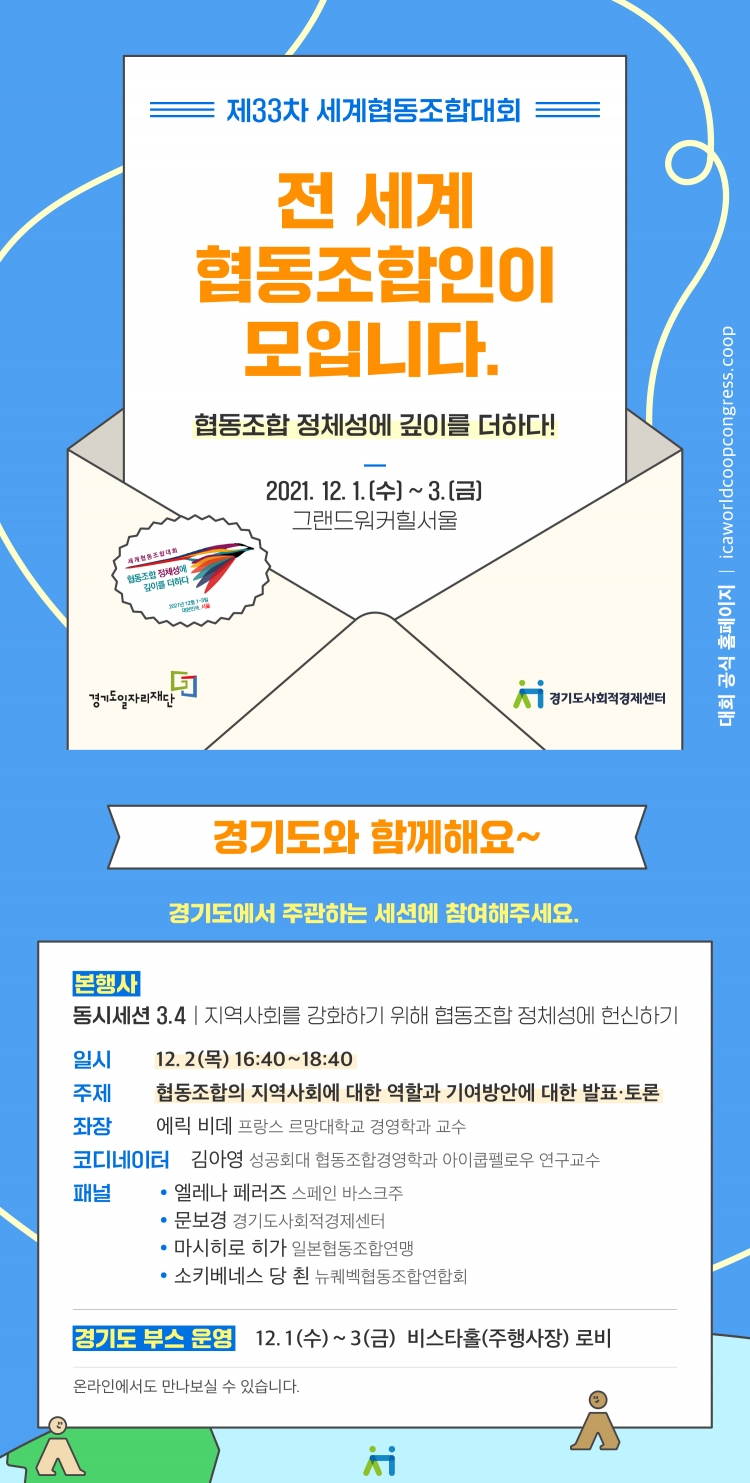 이번 대회는 국제협동조합연맹(ICA) 주최로 12월 1일부터 3일까지 서울 워커힐호텔에서 ‘협동조합 정체성에 깊이를 더하다’라는 주제로 개최된다. 경기도가 한국파트너로 참여하며, 경기도사회적경제센터가 대회 온라인 중계를 지원하고 오프라인 홍보부스를 운영한다.
