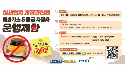 파주시, 12월부터 미세먼지 계절관리제 시행 - 5등급 차량 운행제한, 도로 재비산먼지 관리 강화 등 미세먼지 저감대책 추진