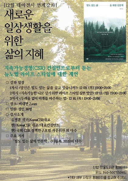 파주시 한울도서관은 9일부터 16일까지 3회에 걸쳐 비대면으로 시선+ 테마전시의 연계 강좌를 개최한다. 강의는 <밀도 있는 삶을 위한 인문학>의 저자이자 국내 1호 지속가능경영(CSR) 컨설턴트인 유명훈 작가가 진행한다.