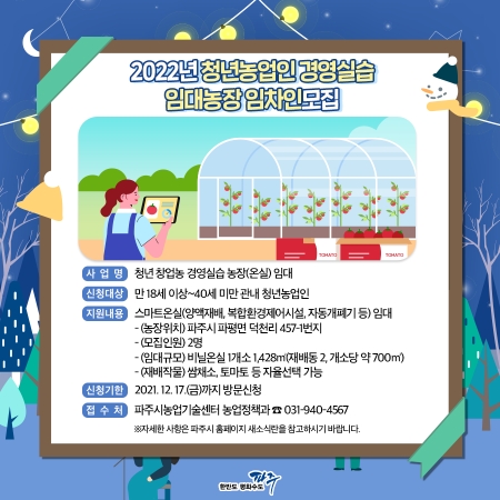 파주시가 ‘청년농업인 경영실습 임대농장’의 임차인을 모집한다. 이는 영농기반 및 경험이 부족한 청년에게 시설(온실)농업 운영 경험, 영농기술 습득 기회를 제공해 창업 후 안정적인 시설 운영 역량을 키우기 위함이다.