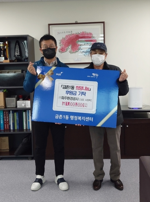 파주시 금촌1동은 지난 7일, ㈜파주환경공사(대표 서정학)가 취약계층 지원을 위한 ‘금촌1동 희망나눔’ 모금사업에 성금 100만원을 기탁했다고 밝혔다.