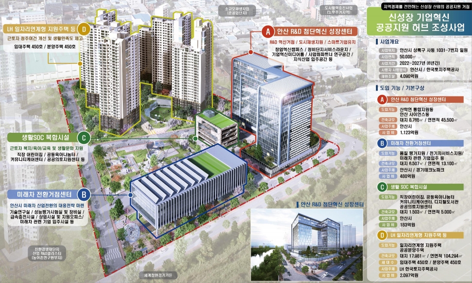 이번 선정된 5곳의 사업내용을 살펴보면 우선 안산시 사동은 도시재생혁신지구 사업으로 사동 준공업 단지와 연계해 자동차 산업 구조고도화를 이루는 게 핵심이다. 연구‧개발(R&D) 첨단 혁신 성장센터, 미래차 전환 거점센터, 생활 사회기반(SOC) 복합시설과 연계한 일자리 지원주택(900호) 공급 등을 통해 지역 일대를 혁신거점으로 조성한다.