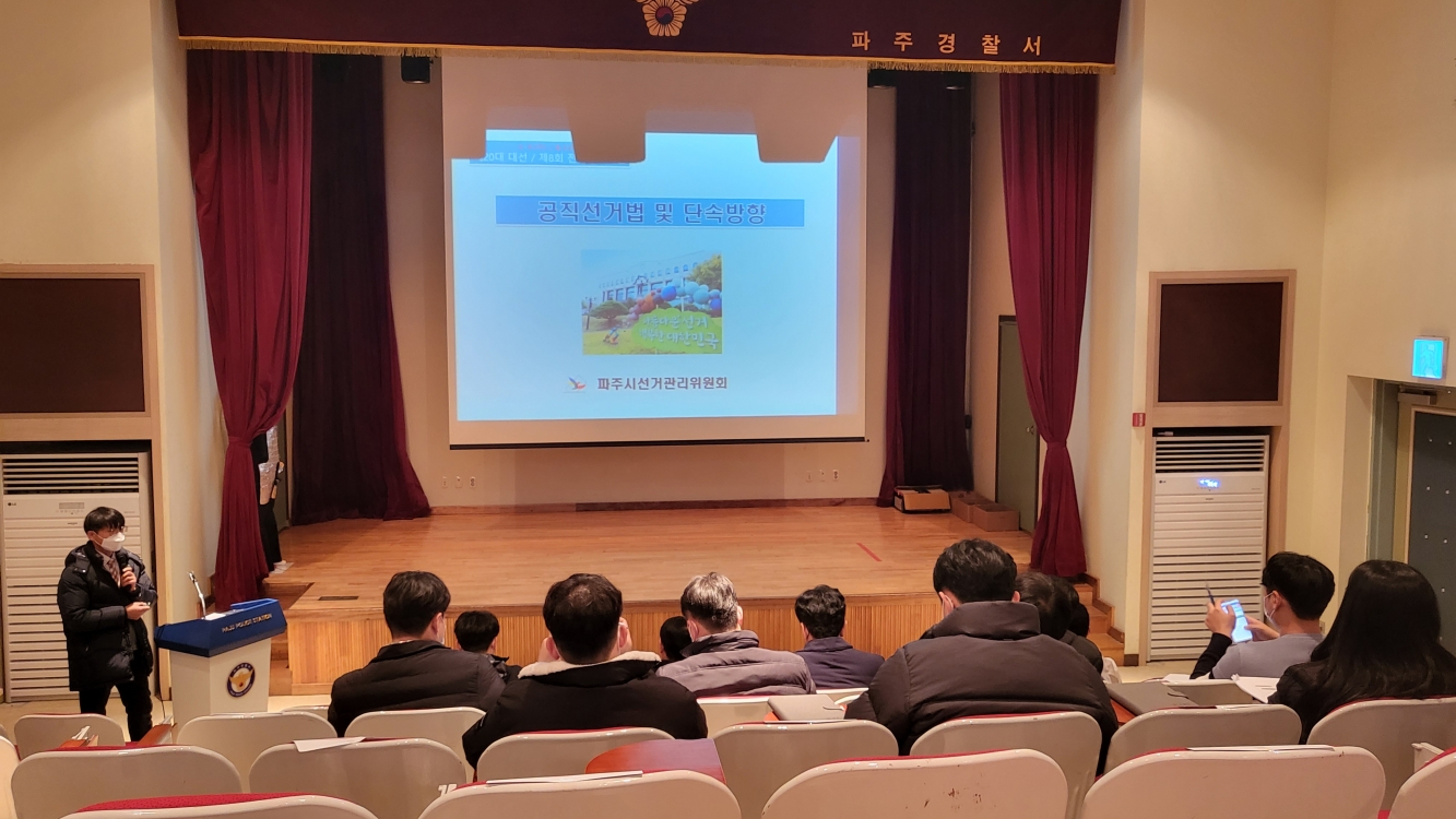 강사로 나선 파주선관위 지도계장 서영삼은 양대선거의 일정, 개정된 선거법 내용, 단속방향을 일목요연하게 안내하여 친절한 선거법 도우미로서 역할을 다하는 한편, 파주경찰서 수사관 스스로도 이번 교육을 통하여 공정하고 당당한 법집행을 다짐하는 시간을 가지기도 하였다.