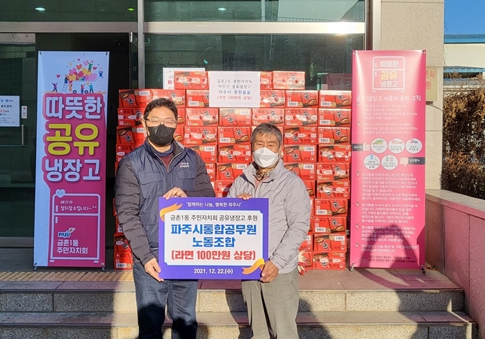 파주시가 지난 22일, ‘2021년 공무원 노사문화 우수행정기관 인증제’에서 받은 포상금으로 마련한 100만원 상당의 라면을 금촌1동 주민자치회의 ‘따뜻한 공유냉장고’에 기부했다.