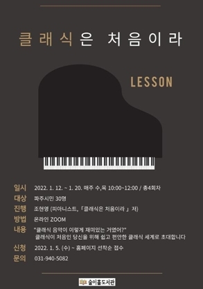 파주시 술이홀도서관은 오는 12일부터 20일까지 매주 수,목(10:00~11:00) ‘클래식은 처음이라’ 교양강좌를 온라인 ZOOM을 통해 진행한다.