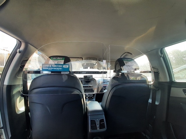 이번에 설치된 방역차단막은 3mm 두께의 투명 폴리카보네이트로 쉽게 깨지지 않는 재질로 운전석과 보조석을 분리하는 개량형 모델로 설치됐다.