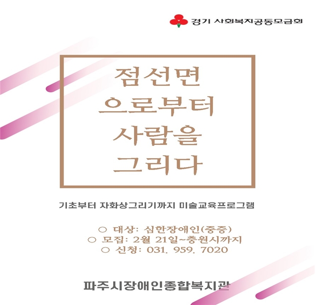 파주시(시장 최종환)는 2월 21일부터 모집 시까지 장애인의 삶에 대한 긍정적 주체성 회복을 돕기 위한 문화예술프로그램 ‘점·선·면으로부터 사람을 그리다’의 신청자 6명을 모집한다.
