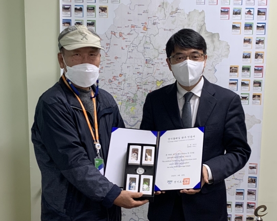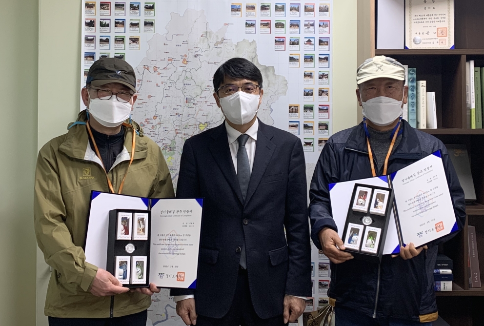 이석범 경기도 문화체육관광국장은 최근 도청에서 경기둘레길 완주자 선우정 씨(73‧수원), 이관표 씨(65‧충북 제천)에게 직접 완주 인증서와 기념품을 전달했다.