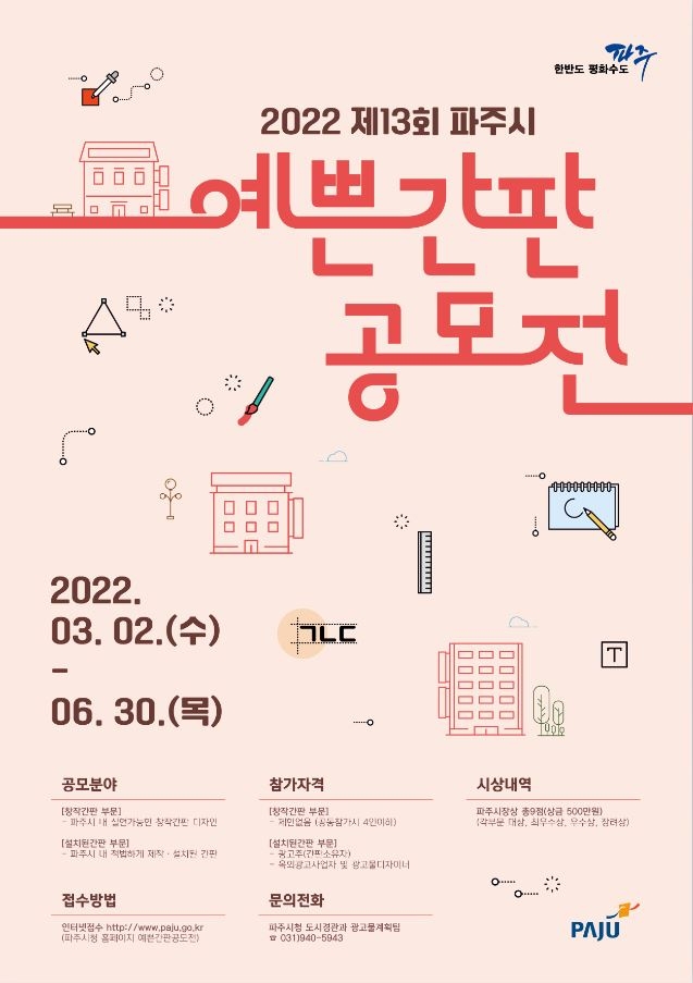 자세한 사항은 파주시 예쁜간판 공모전 홈페이지(www.paju.go.kr)를 참고하거나 도시경관과 광고물계획팀(☎031-940-5943)으로 문의하면 된다.