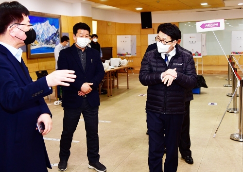 이날 최 시장은 사전투표소 운영 장비 설치 현황과 발열 등 유증상자 등을 위한 임시 기표소 설치 위치를 점검하고, 사전투표 용지 발급 등 실제 투표 절차를 꼼꼼히 살펴나갔다.