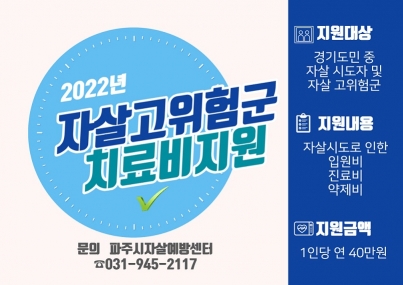 파주시민의 자살예방을 위해 파주시가 운영하는 파주시자살예방센터는 경기도 생명사랑 치료비지원 사업의 일환으로 자살고위험군 치료비를 지원하고 있다.