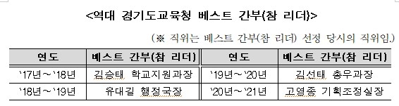 ‘경기도교육청 직장협의회’는 소통·협력하는 조직문화 정착과 활기찬 직장분위기 조성을 위해, 전국 시도교육청 중 유일하게 2017년부터 베스트 간부 공무원 선정 사업을 추진하고 있다.