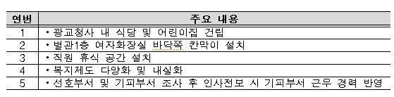 광교청사 내 식당 및 어린이집 시설물의 필요성, 지방공무원 전보제도 개선 방안, 복지제도 다양화 및 내실화 등에 대한 의견들이 있었다.”며,